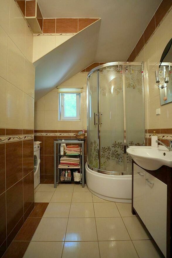 Parter: hol, korytarz, widna kuchnia z piecem kaflowym, jadalnia + salon z wyjściem na piękny zadaszony taras o wym.: 3,0 m x 5,70 m, jeden pokój, łazienka, wc, klatka schodowa.